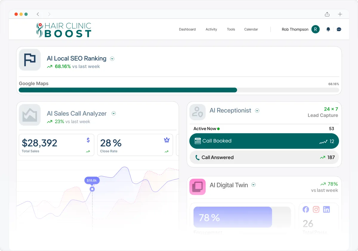 We help Hair Restoration & PRP Clinics dominate their local market, capture every opportunity, and scale without adding overhead. Using AI that works 24/7, we provide a comprehensive system to boost your clinic’s presence.